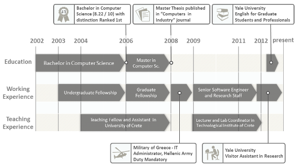 After finishing school in 2002, I moved to Heraklion, where I studied at the department of Computer Science, in University of Crete. I received my diploma with honor in 2006 and i started graduate studies in the same year. I earned a MSc in October 2008, in the scientific fields of Ambient Intelligence (AmI) and Human Computer Interaction (HCI) and my Master Thesis, titled "Tool Support for Designing and Generating Accessible User Interfaces in Ambient Intelligence Environments", published in “Computers in Industry” journal (2010). Alongside my studies I had undergraduate and graduate fellowship with HCI Laboratory of ICS-FORTH, Crete, Greece (2003 - 2008).